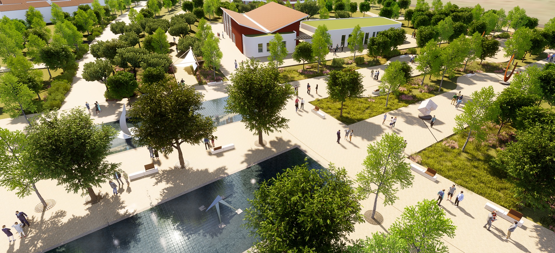 L’autre composante essentielle du projet est fixée par le paysage. L’ensemble du quartier sera immergé dans une canopée d’ombrages et de couleurs. Pour entretenir la forte composante paysagère du site, l’agence propose de mettre en place un système particulièrement innovant pour la production d’eau d’arrosage, consistant à traiter, grâce à une nouvelle technologie, les eaux usées générées par le quartier pour les transformer en eau d’arrosage.