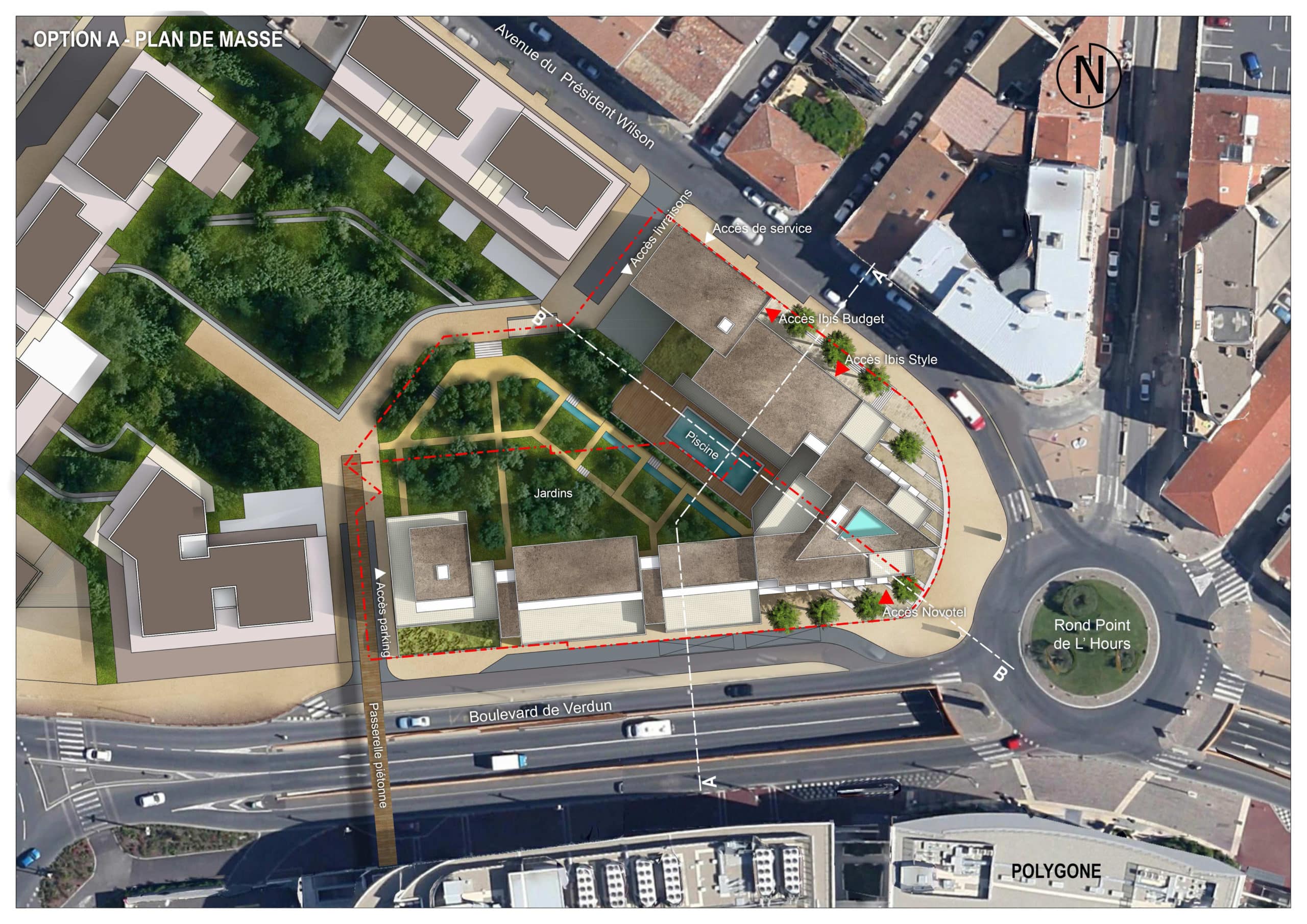 À l’entrée du centre historique de Béziers, à proximité de la gare et du centre commercial Polygone, la ZAC de l’Hours doit amorcer la requalification du centre-ville. Dans ce cadre, un programme regroupant trois hôtels est envisagé en tête d’îlot. En complément de sa forte visibilité, le complexe hôtelier attend une forte lisibilité depuis les axes routiers.
