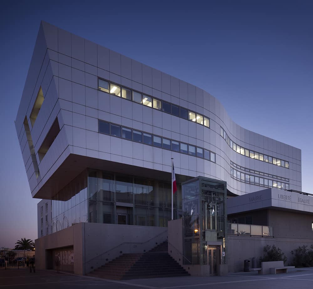 Solidement arrimé à la ville touristique du Grau du Roi, active et commerçante, le nouvel hôtel de ville s’ouvre largement sur la Méditerranée. Disposé perpendiculairement à la promenade maritime, le bâtiment libère un vaste espace piétonnier latéral mettant en relation directe la Place de la Libération et la plage. Sa silhouette élancée, au galbe élégant, ses surplombs et ses vastes terrasses offrant des panoramas incomparables sur la côte, renforcent la valeur symbolique de l’édifice.